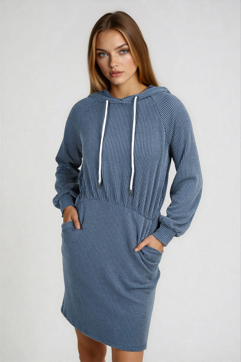 Stay cute and cozy without trying too hard in the Chill Mode Hooded Knit Mini Dress in Blue. Crafted from soft ribbed knit with a relaxed hood and two side pockets, it blends comfort with casual-chic style. The cinched waist flatters your figure while the pockets add a playful, practical touch. Perfect for coffee runs, lounging, or layering with boots for winter weekends—you’ll live in this cozy go-to all season.