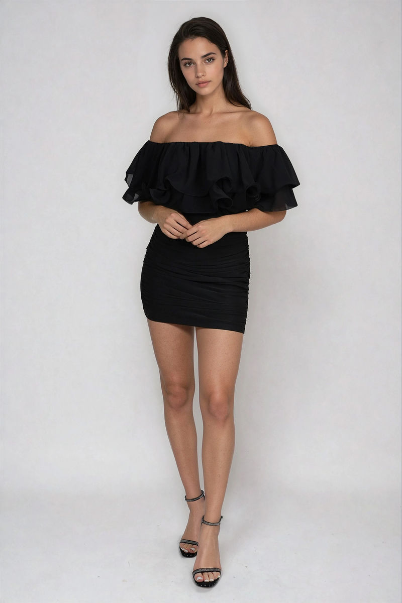 Turn heads in the Honey Lips Off Shoulder Ruched Mini Dress Black, perfect for cocktail parties, rooftop dates, and nights out with the girls. Designed with a flirty off-shoulder ruffle neckline, figure-hugging ruching, and a mini length made to showcase your legs, this dress blends playful charm with sultry appeal. Pair it with statement earrings and heels for a look that’s as sweet as it is unforgettable.