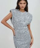 Shine from every angle in the Prism Glow Sequin Sculpted Mini Dress Silver. With bold structured shoulders, a curve-hugging fit, and allover sequins that catch the light, this mini was made for the spotlight. Effortlessly balancing power and glam, it’s perfect for parties, nights out, or whenever you want main-character energy. Pair with sleek heels and let your glow do the talking.